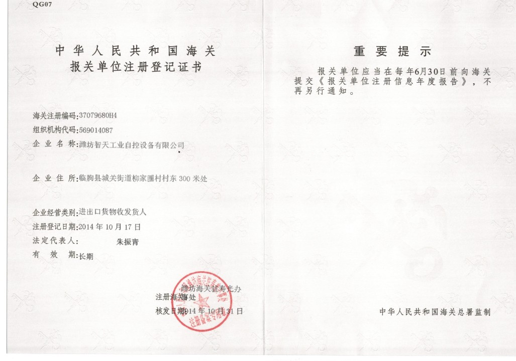 Customs registration certificate